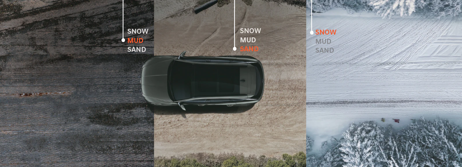 .Multi terrain modes: With a quick flick of the switch, you can adjust the powertrain to suit challenging road and weather conditions: SNOW, MUD and SAND settings ensure you are getting maximum traction when the going gets really rough.